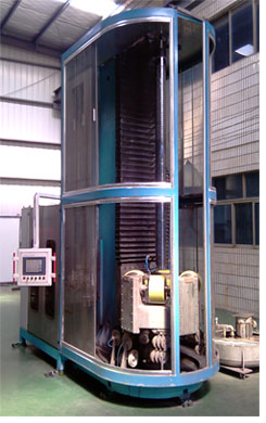 另一種是用金剛石工具切割法,美國(guó)Diamond Wire Technology公司研制出采用金剛石線的數(shù)控多晶硅細(xì)長(zhǎng)硅芯多線切割機(jī)床,用于硅芯的制備,見圖1。通過利用電鍍上金剛石微粒的細(xì)鋼絲線在被加工工 件上高速地往復(fù)運(yùn)動(dòng)或單向移動(dòng),將硅棒壓在該機(jī)床用金剛石線交叉組成的方形線網(wǎng)上,從而將該硅棒切割成細(xì)長(zhǎng)的硅芯。其優(yōu)點(diǎn)十分明顯,12-16小時(shí)可以切 割出200根左右2.5米長(zhǎng)的7X7或8X8毫米的方形硅芯,電力消耗小,加工效率高;其缺點(diǎn)主要在于操作不方便,如圖1所示,除需要在地面A操作 外,還需要在距地面3米高的操作平臺(tái)B和距地面5米高的操作平臺(tái)C上下進(jìn)行繞線,操作難度大,操作人員需上下跑動(dòng),安全性差,一旦切割過程中發(fā)生斷線,重 新修復(fù)布線時(shí)處理困難,處理時(shí)間長(zhǎng),此機(jī)床使用2根金剛石線組成2組線網(wǎng),需要2套收放線卷繞驅(qū)動(dòng)機(jī)構(gòu),維護(hù)復(fù)雜,成本高,機(jī)床總高度在6700毫米以 上,對(duì)安裝地點(diǎn)的房屋要求高,并且其線網(wǎng)結(jié)構(gòu)固定,只能切出方形或長(zhǎng)方形的硅芯,無法切出表面積更大的菱形硅芯,以縮短多晶硅還原爐的反應(yīng)時(shí)間,提高單位 時(shí)間的多晶硅產(chǎn)量。